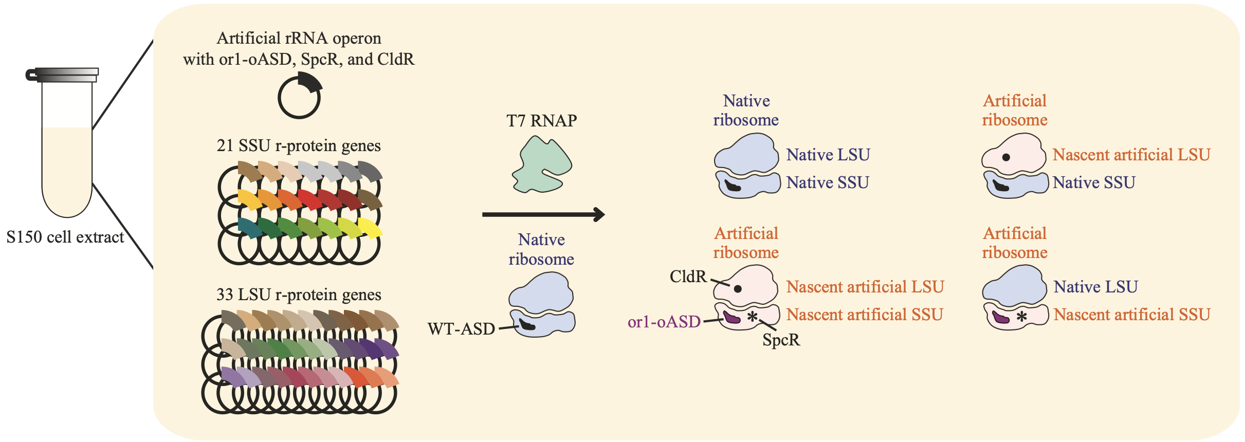 Specifically, we prepared an E. coli S150 cell extract to serve as the reaction's foundation, as it is thought to contain all 100 accessory proteins required for ribosome biogenesis (Figure 1). The S150 extract is the supernatant fraction obtained after centrifuging an E. coli lysate at 150,000 x g. To better replicate the intracellular chemical environment, we supplemented this extract with various small-molecule compounds abundant in E. coli, such as potassium glutamate, magnesium glutamate, spermidine, and putrescine. Next, we added approximately 50 factors essential for transcription and translation—including NTPs, amino acids, tRNAs, CoA, and NAD—at their proper concentrations. Finally, to initiate the biogenesis process, we introduced native ribosomes, RNA polymerase, the three rRNA genes, and the 54 r-protein genes into the system. Through repeated optimization of these reaction conditions, we achieved the world's first successful in vitro reconstitution of ribosome biogenesis.