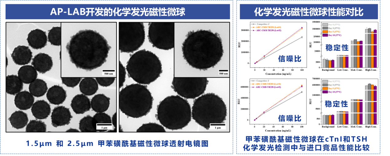 图2. AP-LAB开发的化学发光磁性微球形貌及其与进口竞品在多类型化学发光检测中的性能比较