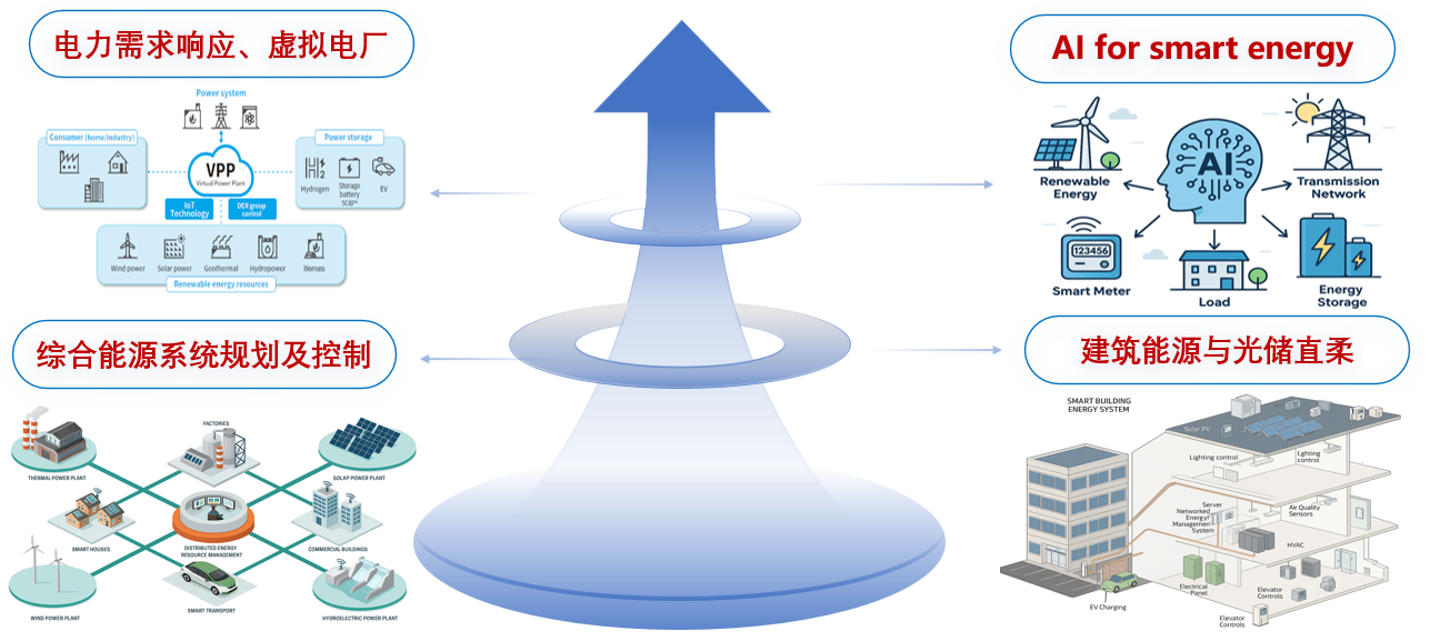 聚焦建筑终端多样化用能场景,研究基于人工智能的建筑能耗建模与负荷预测,融合强化学习实现空调系统、分布式光伏与储能系统的柔性协同调控。通过多源感知数据驱动建筑负荷行为建模,构建源荷互动机制,实现建筑系统的智能化调控与主动响应,全面提升能效水平与清洁能源消纳能力,推动建筑向智能、低碳、自适应方向演进。