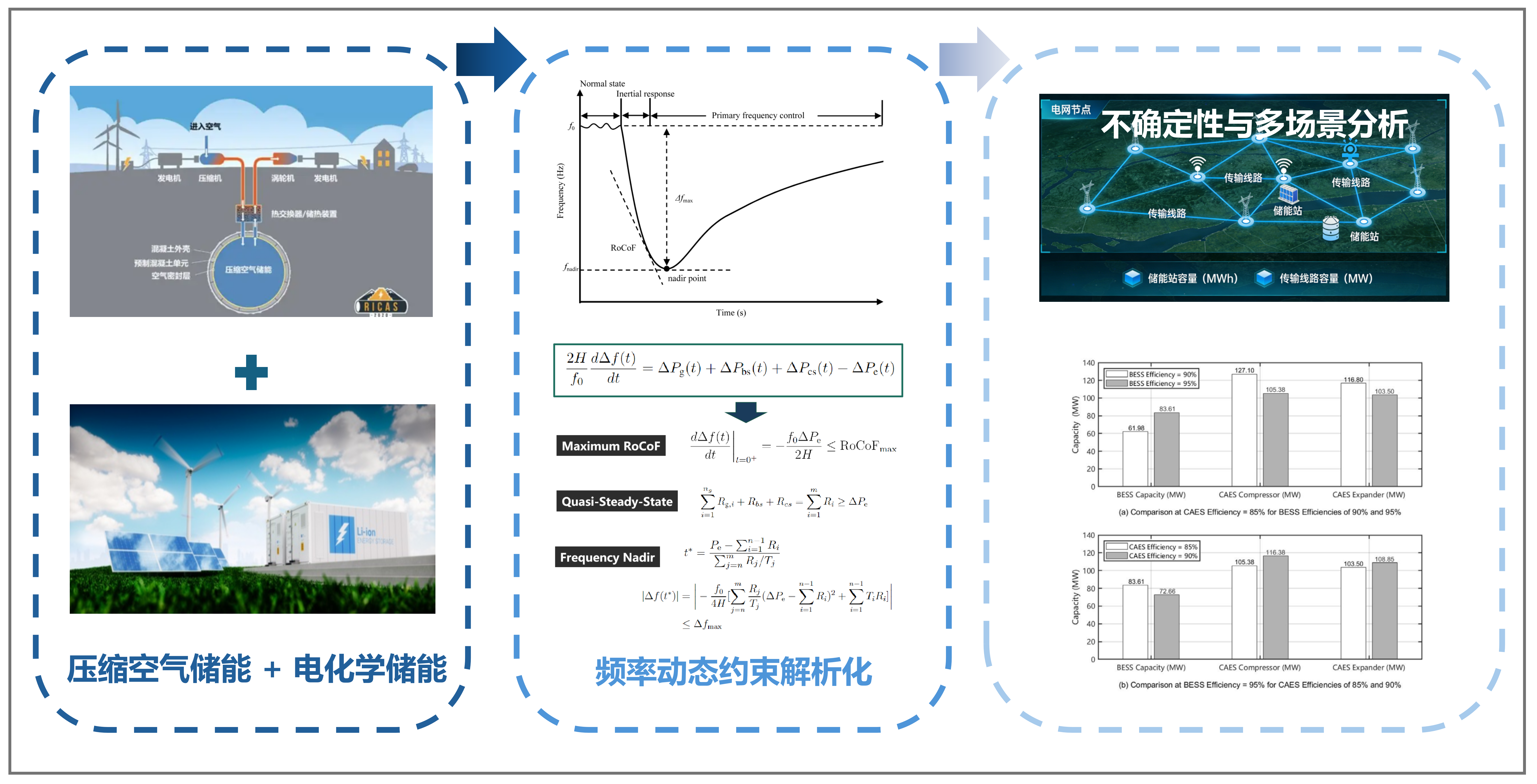 针对新能源高比例接入背景下电力系统惯量下降及频率稳定风险上升的问题,开展了面向频率安全的储能系统规划研究。考虑电化学储能与压缩空气储能在响应速度和持续时间方面的互补特性,提出了一种混合储能协同优化配置方法。通过对电力系统摇摆方程进行解析推导,将频率最低点、频率变化率等动态安全指标转化为可嵌入规划模型的解析约束,从而避免传统规划方法中大量动态仿真的计算负担。该方法能够在满足系统频率稳定约束的前提下实现储能容量的经济优化配置,为未来高新能源电网中的储能规划提供技术支撑。