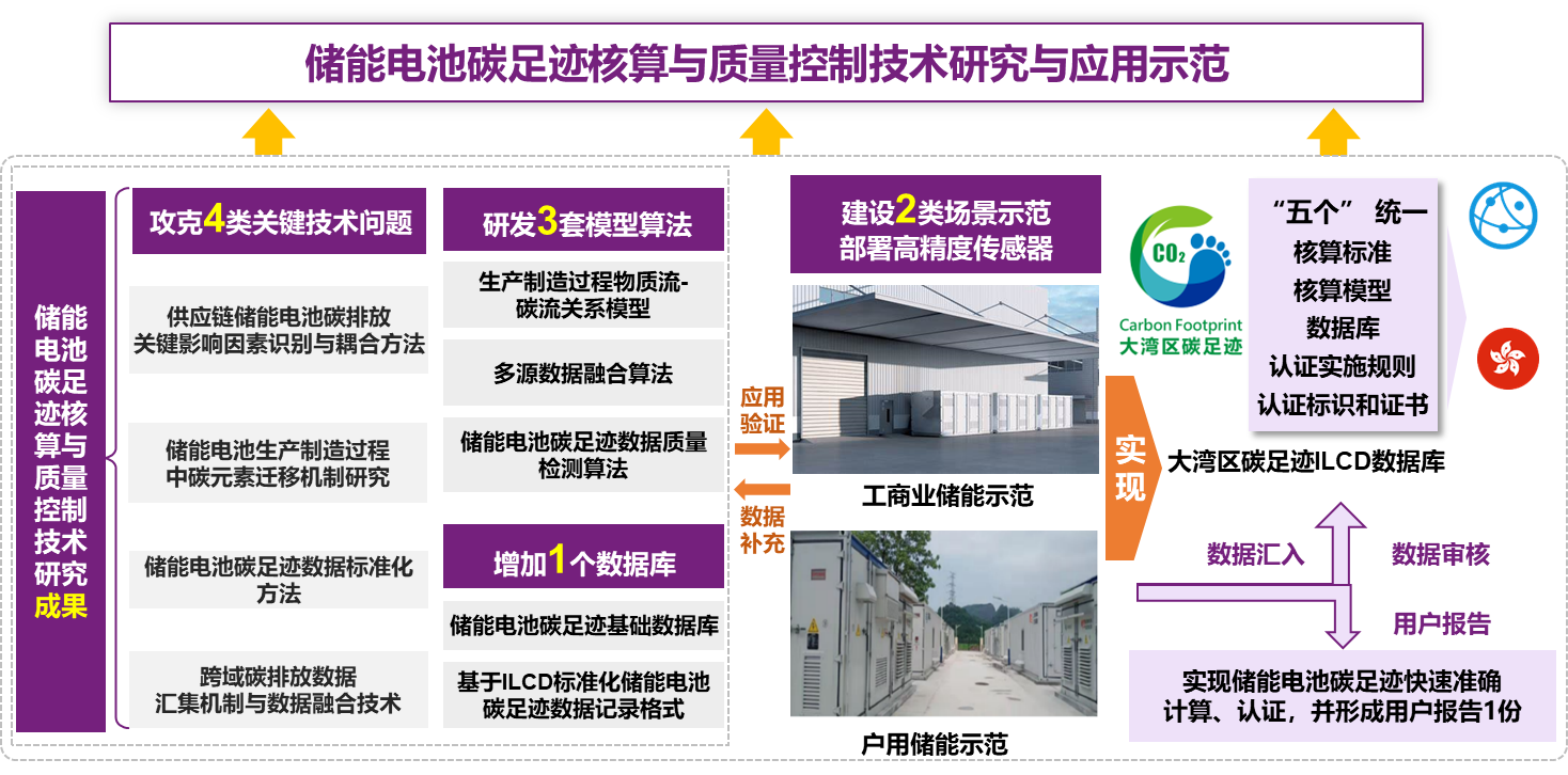 以储能电池行业的供应链为载体,研究供应链储能电池碳排放与关键影响因素识别,碳元素迁移机理与减碳研究,储能电池数据质量控制方法,以及跨域碳排放数据汇集机制与数据融合。选择储能电池2个应用场景进行技术示范,构建贯通供应链、生产制造等多源异构碳排放特征数据融合和集成技术示范,开发并完善储能电池碳足迹基础数据库与计算工具。