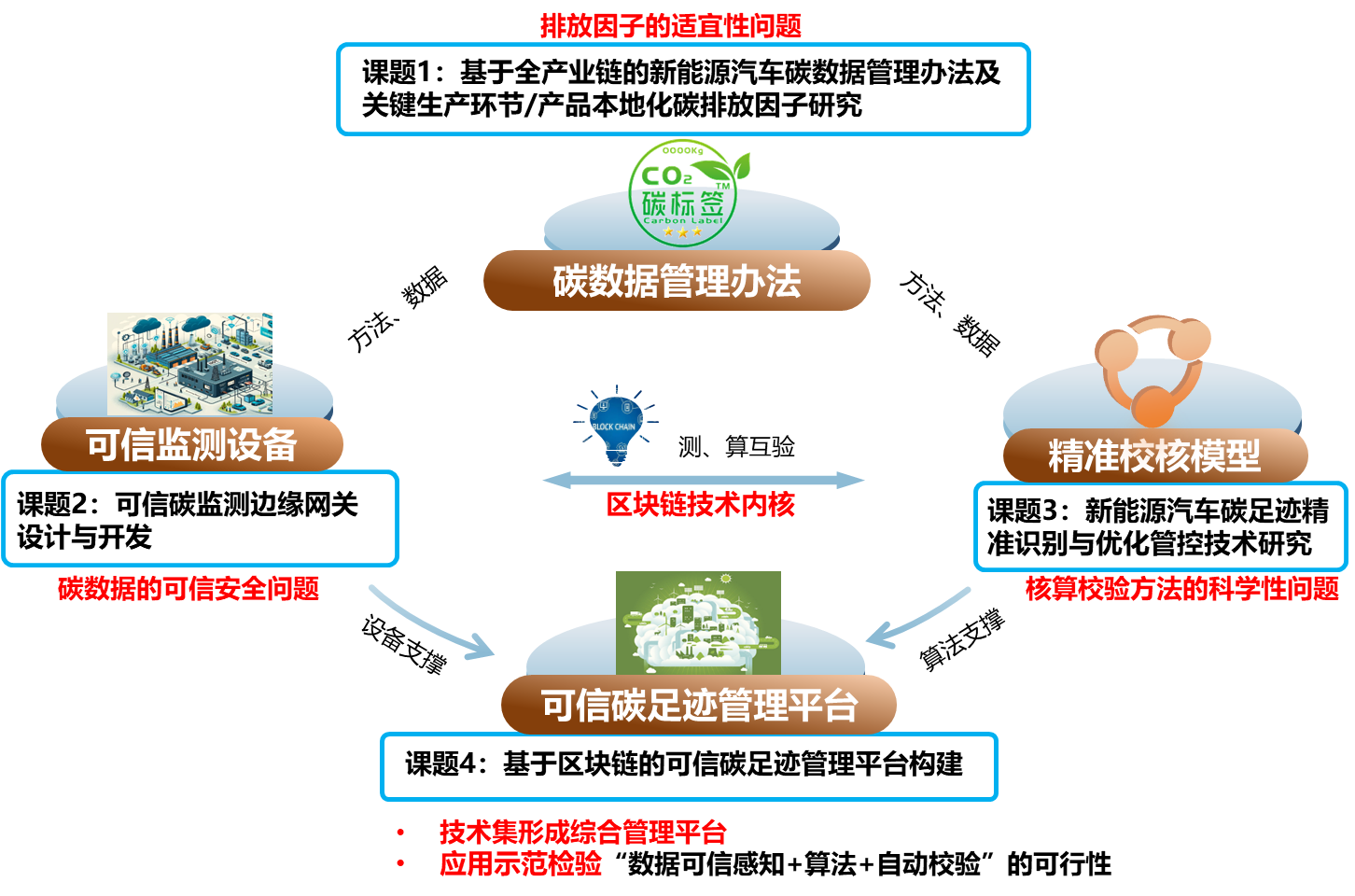 本项目预期可形成新能源汽车碳数据管理办法研究报告、可信碳监测区块链网关设备、基于全生命周期评估方法(LCA)的新能源汽车供应链碳数据精准识别校准与优化调控技术、基于区块链的可信碳足迹管理平台等技术成果并申请相关专利知识产权,同时开展相关技术的应用示范。