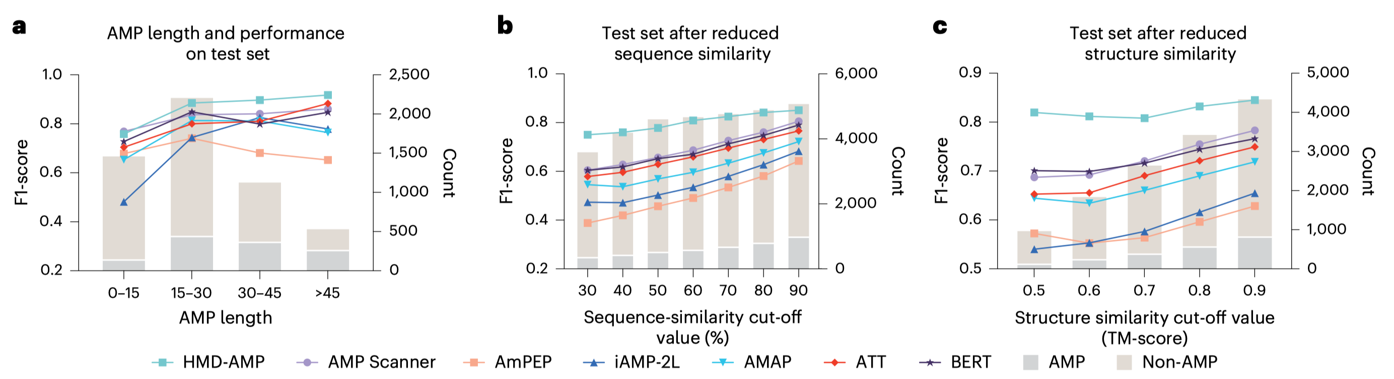 在多项基准测试中,HMD-AMP均表现出优异性能。尤其在低序列相似性、低结构相似性的严苛测试条件下,其表现显著优于现有方法,达到国际先进水平(图2)。同时,模型预测分数能够有效反映实际抑菌活性,为高活性分子的快速筛选提供可靠依据。