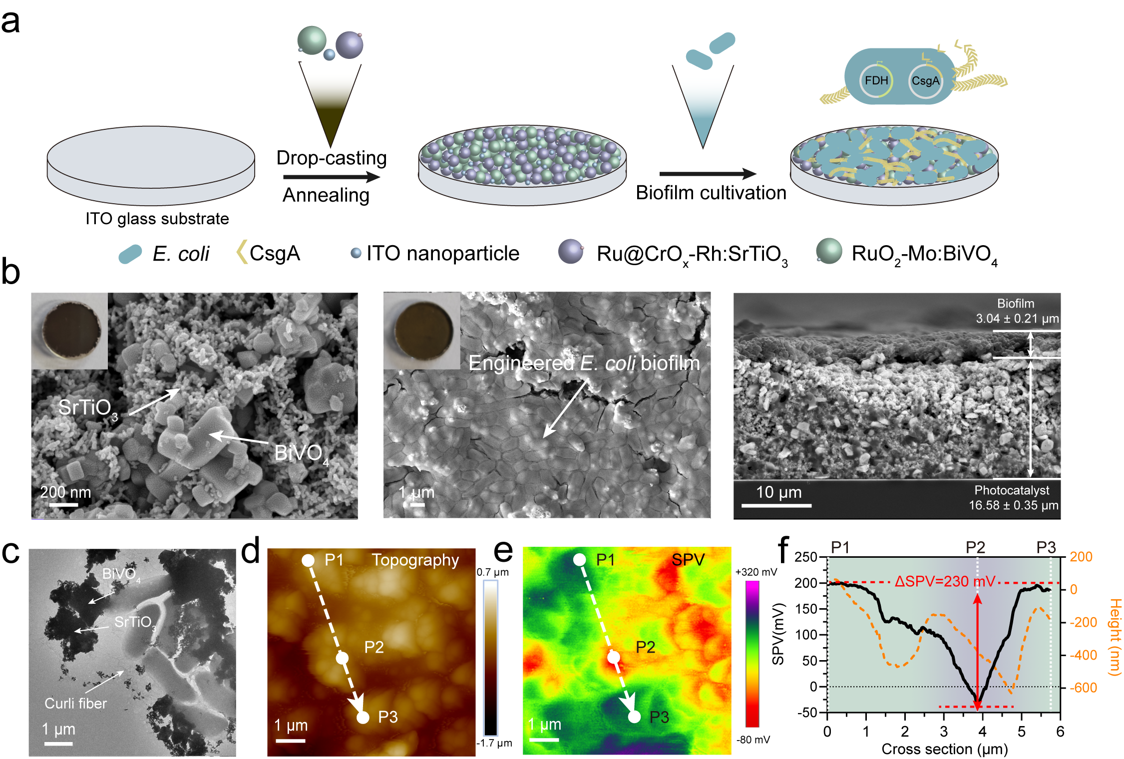 图2. 光催化剂-生物被膜生物杂合体系的制备与结构表征