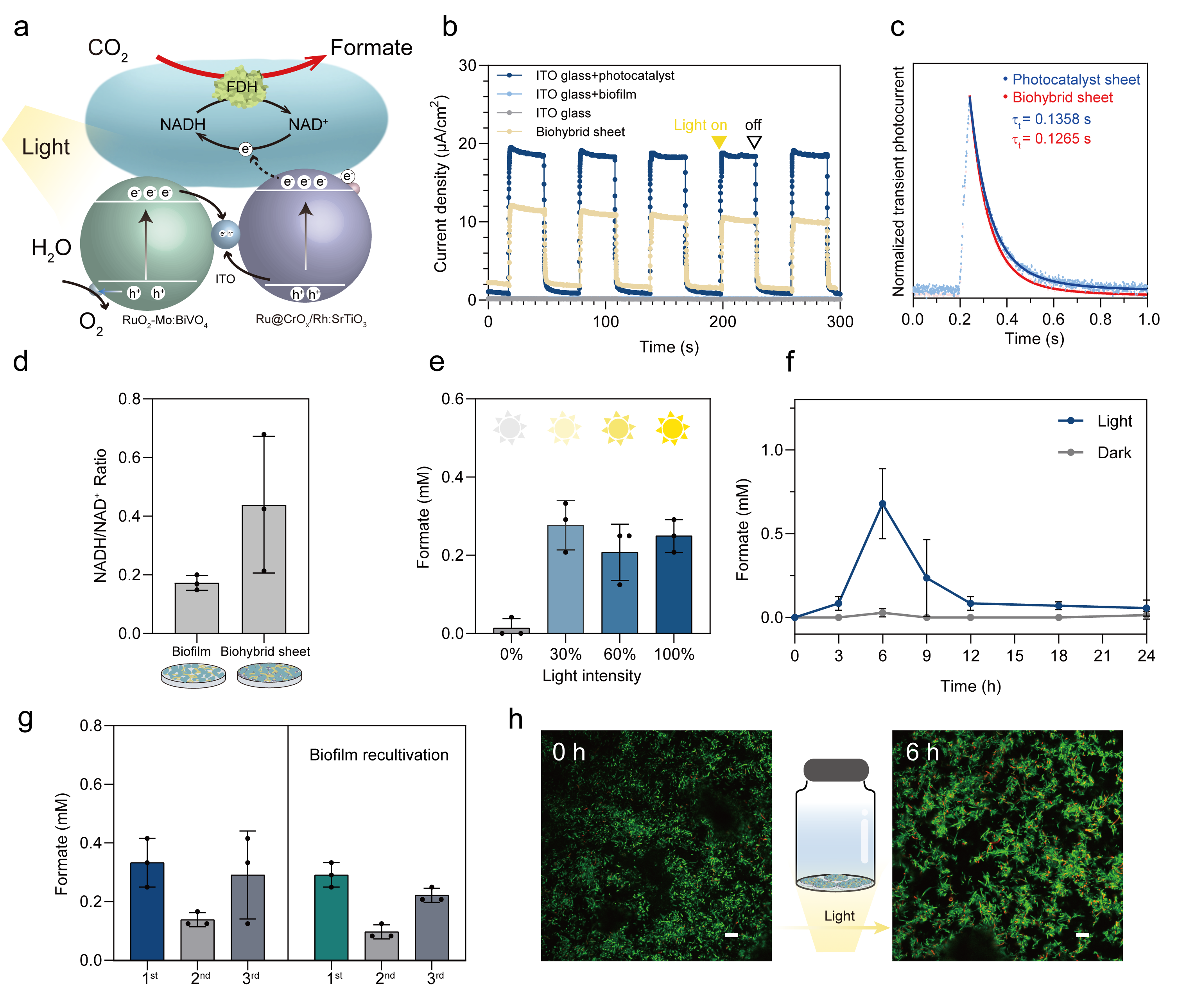 进一步,团队改造大肠杆菌生物被膜实现双功能:其一,通过共形贴附使生物被膜在光催化剂表面形成均匀致密涂层;其二,在胞内表达甲酸脱氢酶(FDH)赋予CO₂固定能力,利用光生电子驱动CO₂还原生成甲酸。由此构建的光催化剂-生物被膜复合体系,模拟了天然光合作用的光能转化路径——光生电子高效传递至工程菌细胞内驱动甲酸合成,空穴则被水氧化消耗,形成无牺牲剂的完整光驱动反应循环。电化学测试表明,该杂化体系光照下瞬态光电流显著优于对照体系;电荷动力学分析显示,生物膜引入后电子传输时间缩短,细胞内NADH/NAD⁺水平提升2.5倍,验证了光电子成功参与代谢反应。